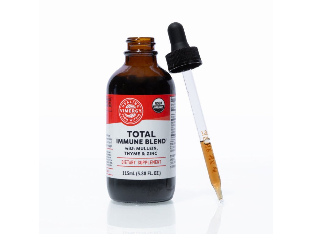 Vimergy Total Immune BlendTM kombinuje léty prověřené byliny Mullein a Thyme se silným tekutým zinkem, které poskytují antioxidační imunitní ochranu po celý rok.